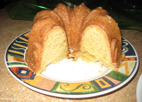 Our first project was rum butter cakes to give away to friends and neighbors. I was inspired by the Effie Marie rum butter cakes that I remember being able to buy at Macy’s during the holidays when I was a teenager. They’re only available online now, but that’s fine as M and I are making a concerted effort to bake goods ourselves whenever it seems feasible. I found and used the recipe by Darla at Bakingdom, it being one of the few recipes I found that actually had substantial amounts of rum in it. We had to go purchase small bundt pans for the purpose, but as we’ll probably use them every year now in an effort to establish a family tradition, I don’t mind the expense too much. We made a slight addition to the recipe — we added dried currants to the batter (well, at least on our first test cake anyway, then we completely forgot about our good idea and all the other cakes were currantless, go fig).