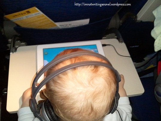 That’s G playing Angry Birds*, with headphones on (so his beloved swing music entertained him and not those around him). I can’t even describe how awesome G was on the flights. He didn’t sleep nearly as much as we expected (or hoped), but entertaining him was a mostly not-too-horrible experience. Yay!